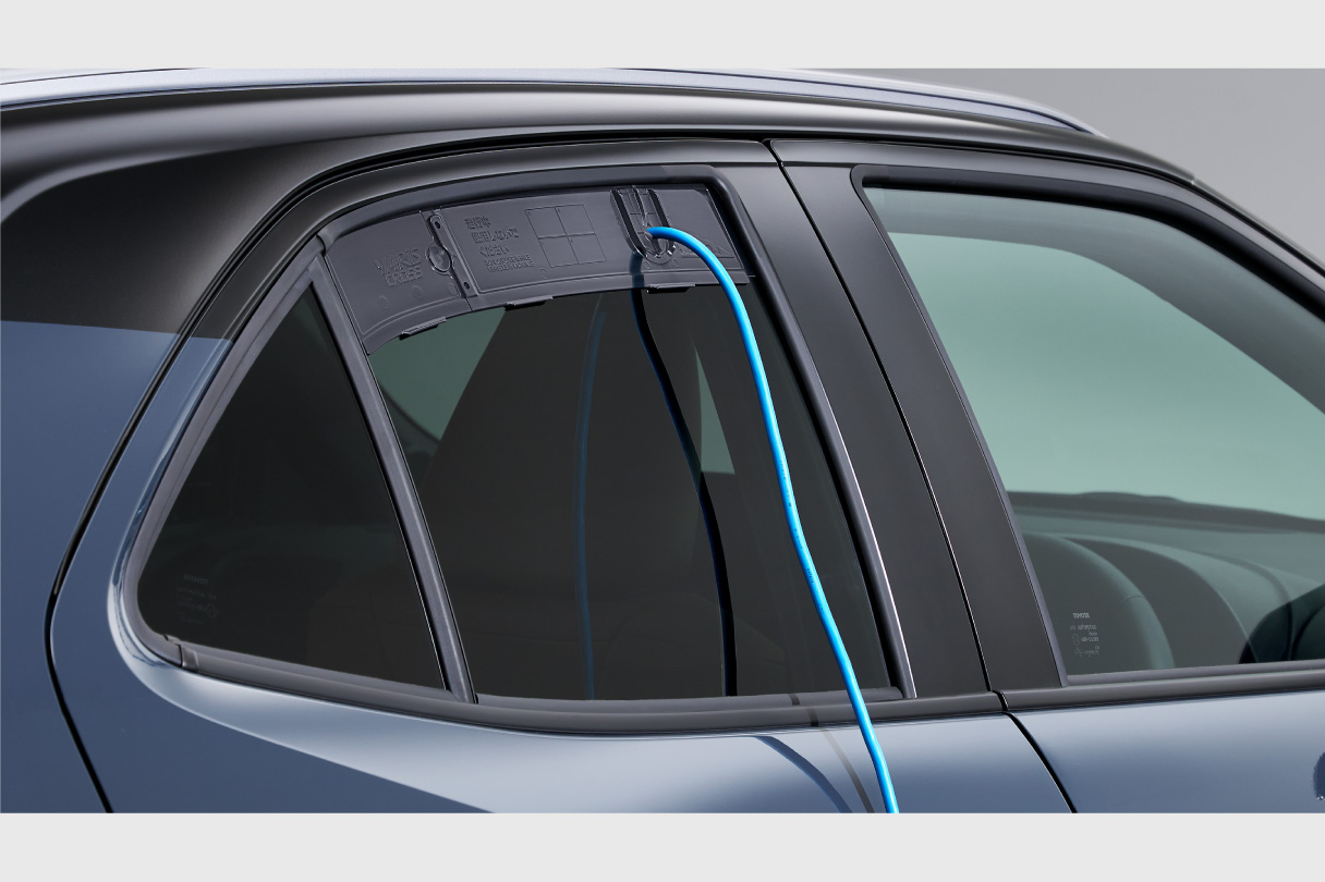 野外でも安心して給電できるよう、ドアと窓を閉めたまま電源コードが出せる外部給電アタッチメントを設定。車内への虫などの異物の侵入や、雨天時の水の浸入を予防します。